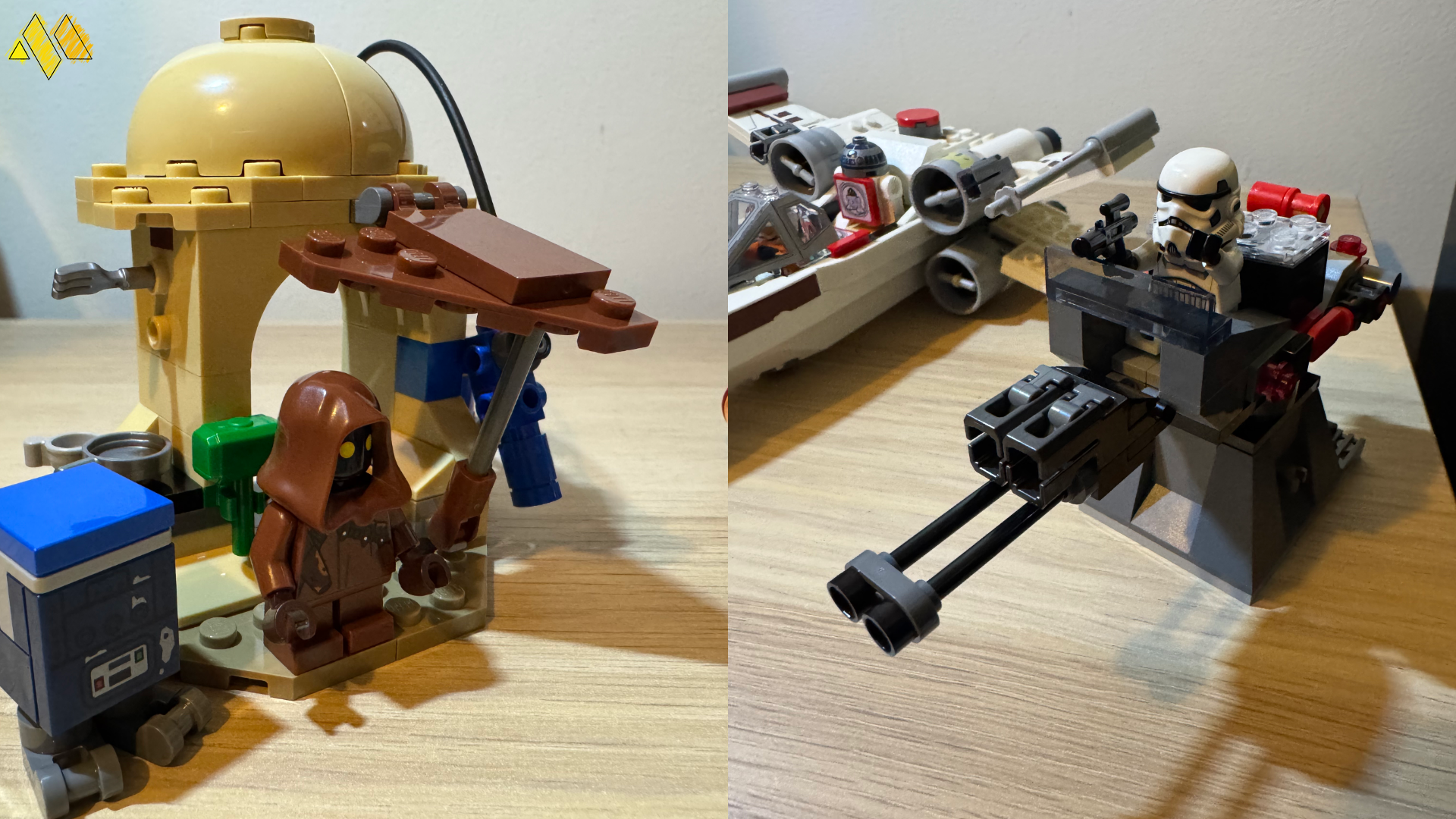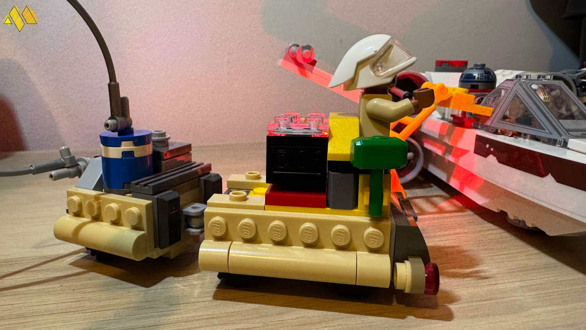 In the three sets that Lego sent to me, there were two that came with a Smart Brick each and one that did not. I will start with the latter, which was Luke's Landspeeder. The set itself is on the smaller side, with a little over 200 pieces included in the box and some of those are used to build what I am calling Toshi Station, which is a little refuelling place. Sticking with the Landspeeder itself, if you compare it to a recent normal set, not the one from the Ultimate Collectors series, it looks quite similar. The general shape and scale is the same, but there are less custom and detailed pieces, in fact the only major difference between them is the lack of instrumental panels inside and the rear is not the same. There is of course quite a big difference to the seat in this newer version, which is because there is a space behind it for the Smart Brick. Once you put the Smart Brick on the tag for the Landspeeder, it begins to make the hovering noise that the vehicle makes in the original movie. Once you place the included Luke Smart Minifigure into the vehicle as well, he speaks as you move it about, it is quite clever.