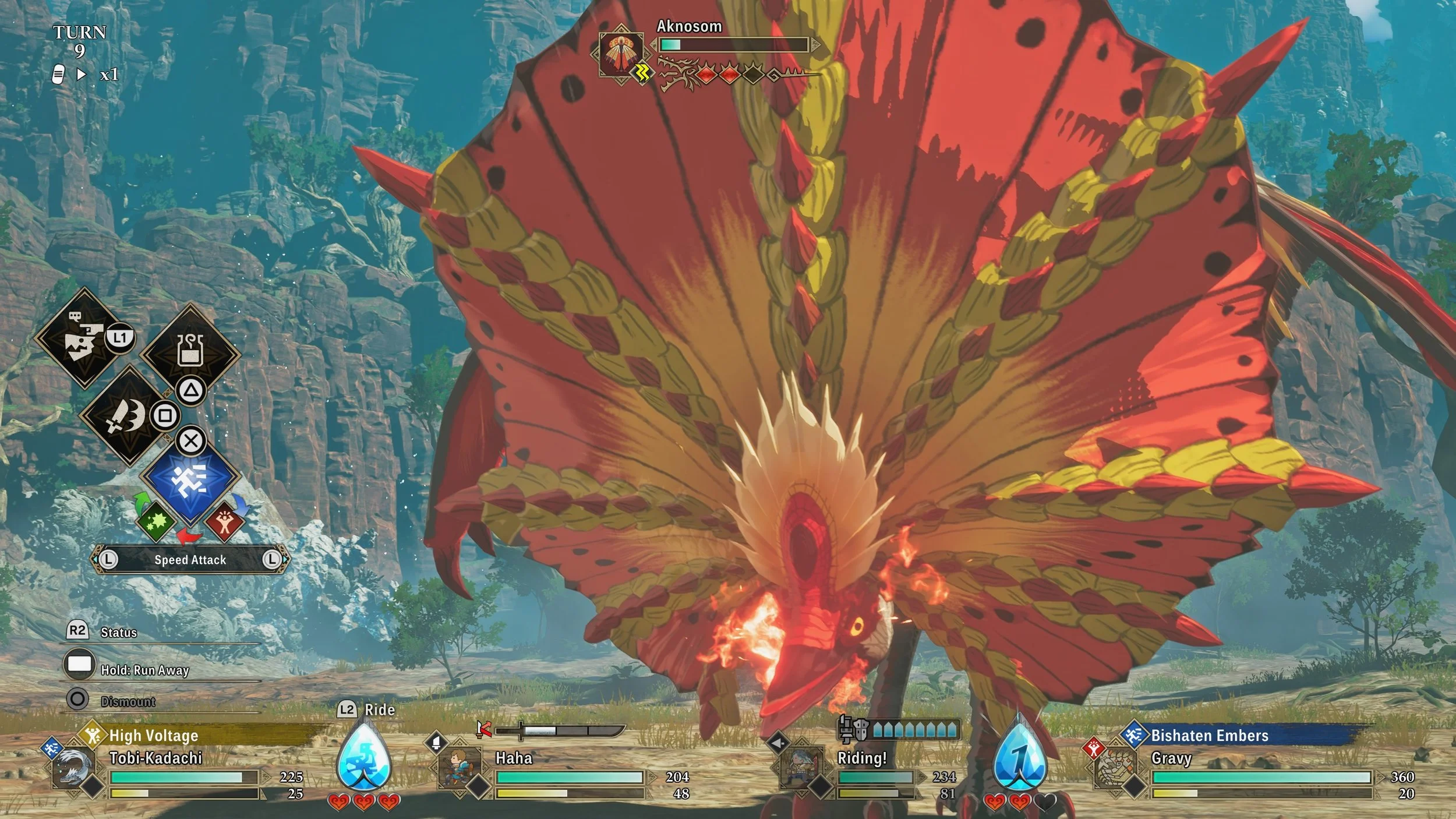 The monsters are mostly ok, I think they are the weakest visual element, not in their design or such as Monster Hunter has always had great designs, but just in how much they repeat. As you restore regions and more monsters come back to the land, you will see more of the same type, just with a different colour, like pink, green or purple. There are stronger variants later on that do look a bit different, but by then you will have encountered so many of them, the look loses its appeal. One thing I would have loved to have been able to do is turn off attack animations, because of all that grinding, the number of times I had to see Kora throw a barrel or Thea summon a Poogie hoard was insane. The game does let you play battles out at two-times speed, but that literally only impacts the speed, all those animations still play out.